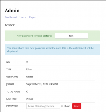 Add a new "Reset Password" button to a user profile in the admin dashboard. When pressed, generate a password (similarly to what we do on Write.as) and display it nicely to the admin, instructing them to send the new password to the user.